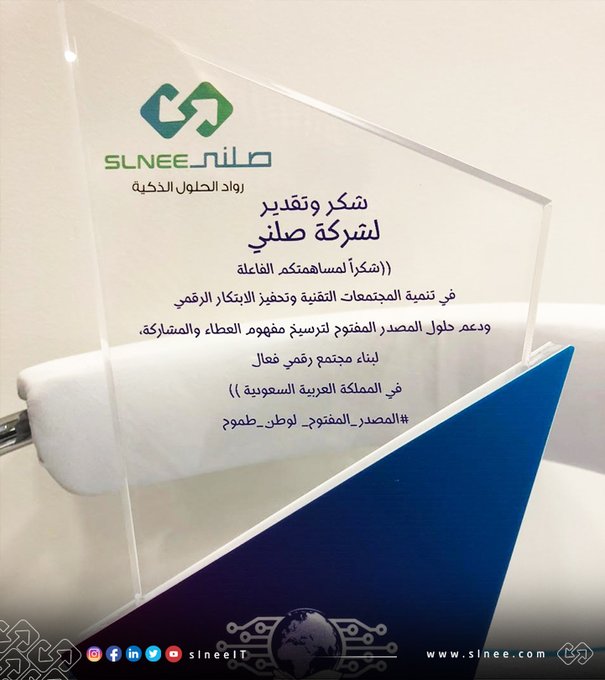 تكريم شركة صلني عام 2020 لمساهمتها الفاعلة في تنمية المجتمعات التقنية وتحفيز الابتكار التقني ودعم حلول المصدر المفتوح ودعم الشركات الصغيرة والمتوسطة من خلال مبادرة عطاء التابع لوزارة الاتصالات وتقنية المعلومات.